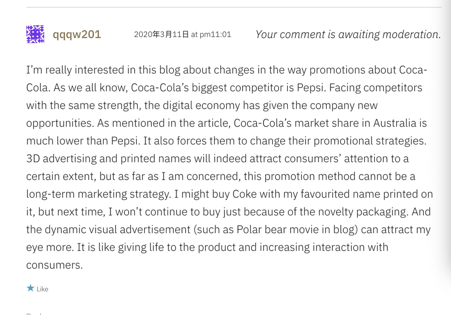 These are my comments to other bloggers. Some of the comments have been replied. He expressed his recognition of my views. I and he also carefully discussed the problems facing Coca-Cola Company and the impact from the latest stock plunge due to the epidemic. This experience also makes me more like to comment on other bloggers and give my own views. I think this will make learning more interesting and understand some social issues more deeply.